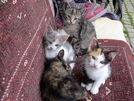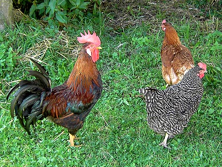 Katzen und Hühner, einen Teich mit